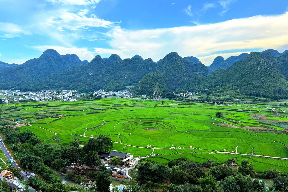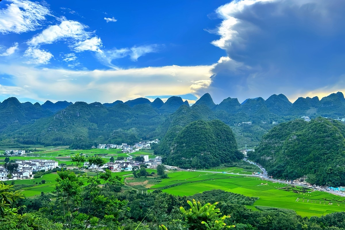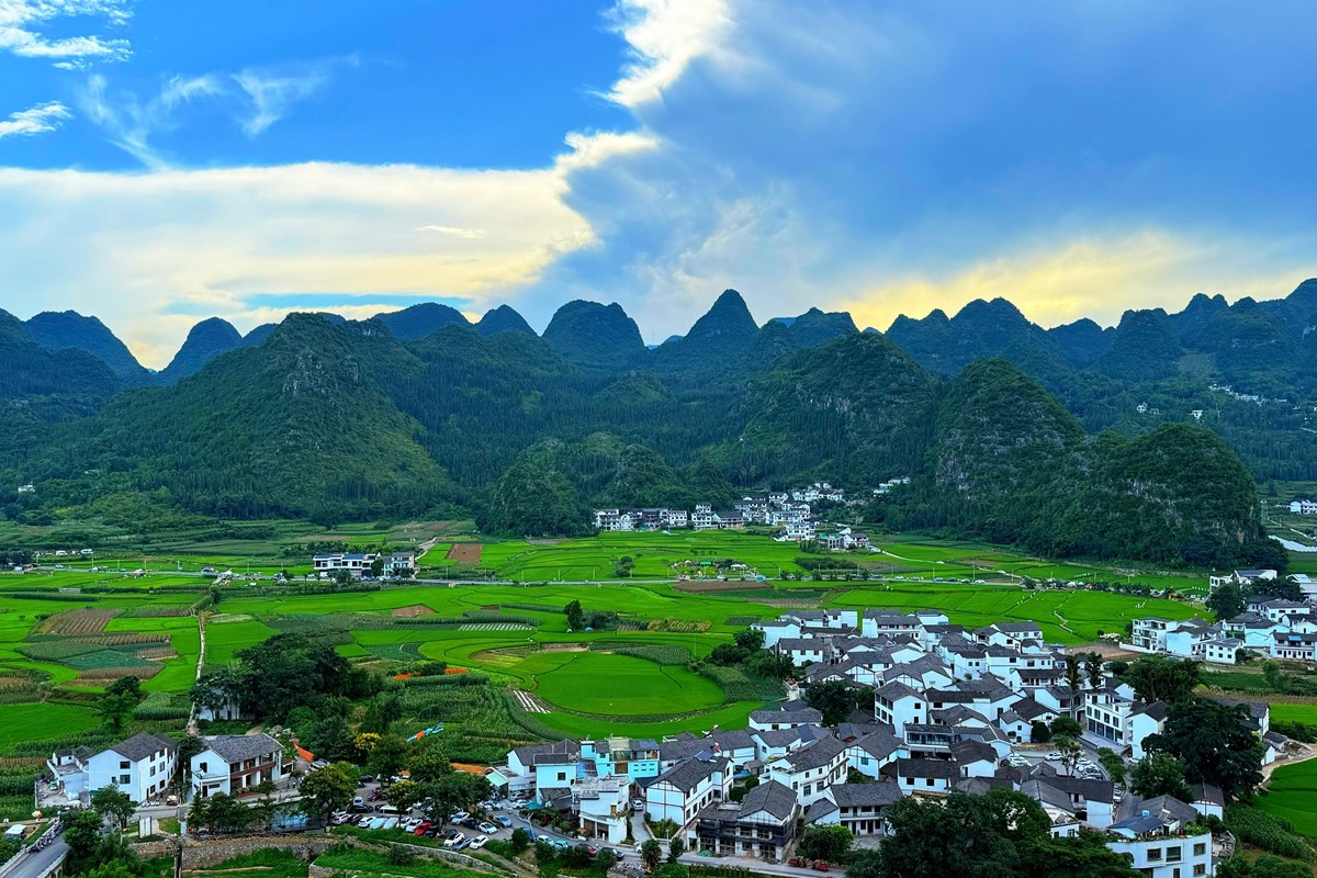 万峰林位于贵州省黔西南布依族苗族自治州兴义市,是天下上最大、最典范的喀斯特峰林地貌之一,被誉为“天下异景”。这里群峰绵延数百里,形态各异,巨细峰林狼籍有致,宛如绿色的海洋。山间村寨遮掩其间,梯田层层叠叠,与碧绿的田园交相辉映,组成一幅奇异的田园画卷。(电力公司 张世博)